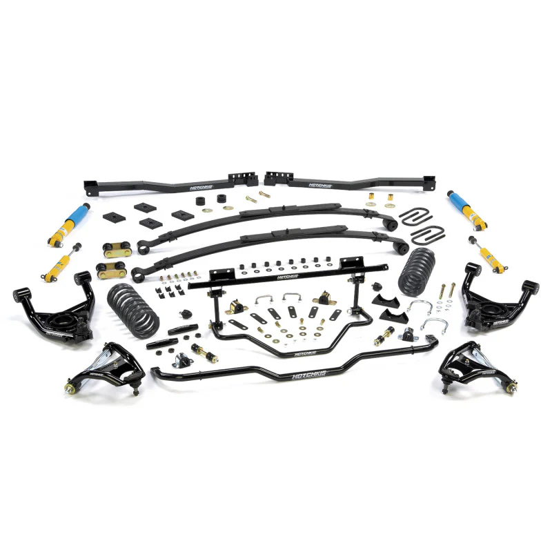 Hotchkis Sport Suspension 80014-2 Stage 2 TVS Kit Extreme with 2 in. drop for 1967-1969 Camaro and Firebird Coupes with Big Block motors. Includes Adjustable Rear Sway Bars 1 1/8 in Front and 7/8 in. in rear with Chassis Max Sway Bar Brace 2 in. Lowered Sport Springs 1.5 in. Lowered Leaf Springs (3 Inch Kit Also Available) and Front and Rear Hotchkis Tuned/Bilstein Shocks Sub Frame Connectors (Chassis Max Brace Also Included on Convertible Kits) all necessary Hardware and Bushings with Heavy Duty Tie Rod Sleeves also included. One Convenient Kit for the ultimate handling GM F-Body Camaro or Firebird nothing beats the Hotchkis Sport Suspension Stage 2 Total Vehicle System. This kit has been rigorously designed and tested on the track yet is very comfortable for your local cruise in. Every aspect of the suspension has been re engineered for the maximum performance and is being offered in a complete tuned package. In front we start out with Tubular Upper and Lower Control Arms which increase caster and improves the camber curve creating more front end grip and traction. Heavy duty tie rod sleeves hold the alignment while 2 in. (3 in. also available) lowered sport springs and Hotchkis Tuned/Bilstein shocks improve vehicle control and stance. A massive 1 1/8 in. front sway bar and 7/8 in. adjustable rear sway bar reduce body roll and improve handling. To improve traction and reduce wheel hop the rear gets a 1.5 in. (3 in. also available) multi leaf drop spring which features a Hotchkis exclusive design that utilizes an overload spring to reduce axle wrap up. The kit comes complete with heavy duty shackles u-bolts pads and all necessary hardware. To stiffen the chassis Hotchkis includes sub frame connectors and a rear sway bar cross member creating a complete package. This system is a proven autocross winner and designed for maximum performance improvement in a installer friendly kit. PROUDLY MADE IN THE USA